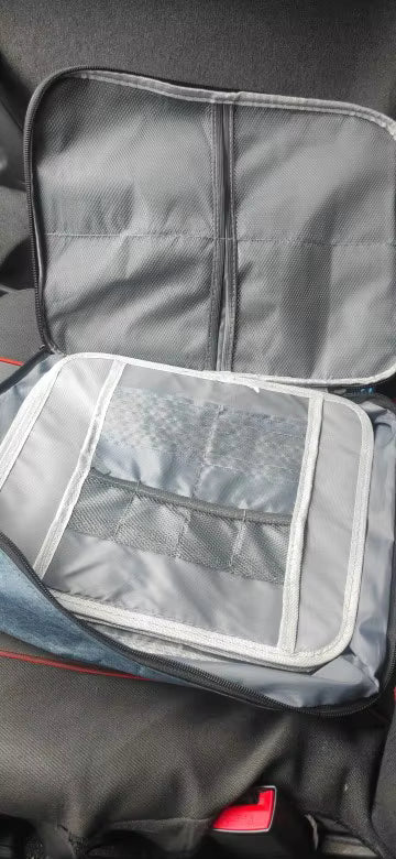 Compartimentos organizados — espacio para pasaportes, tarjetas, USB, tablet, documentos grandes.