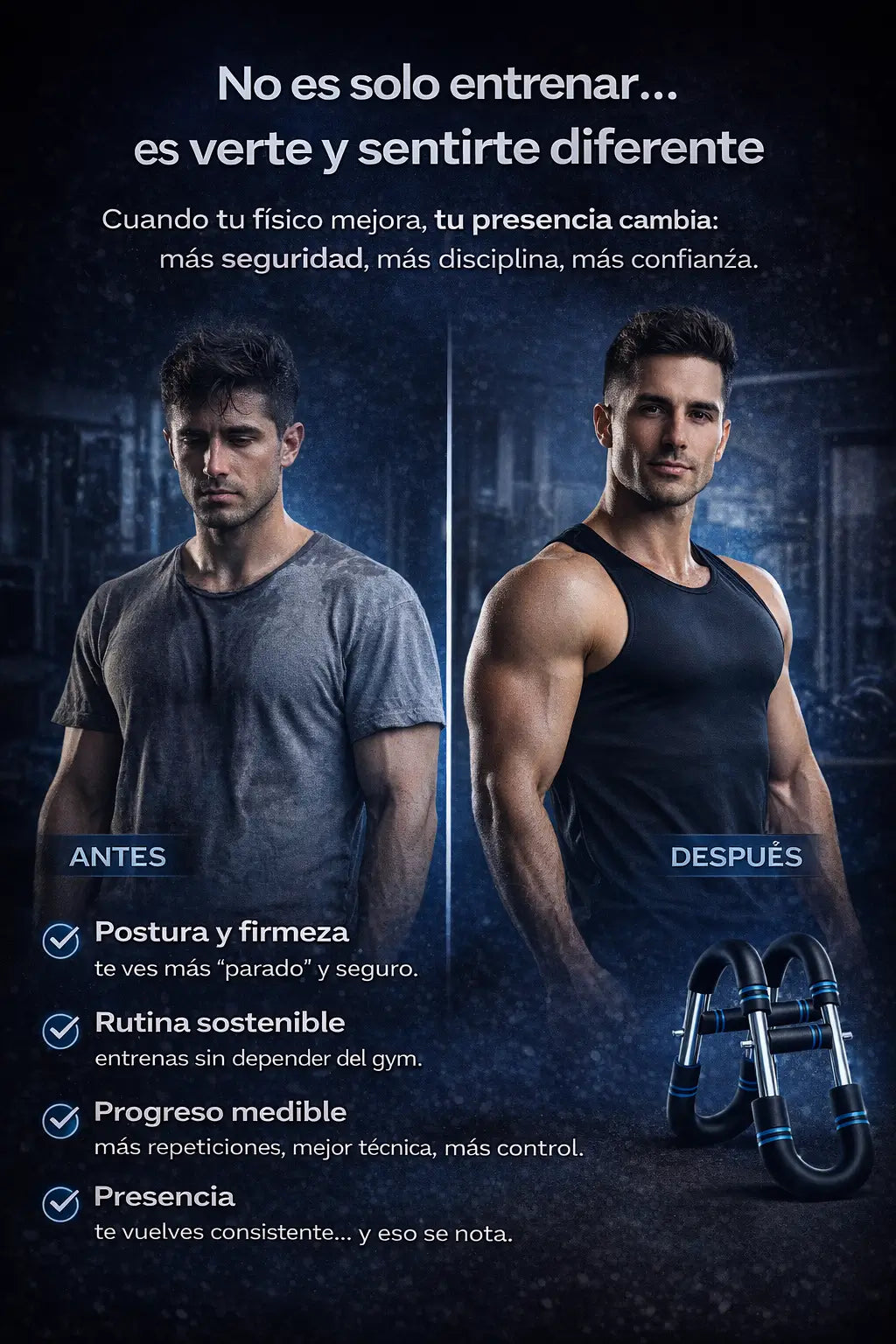Al fortalecer pecho, hombros y espalda, tu postura mejora y la ropa sienta diferente. La confianza viene sola.